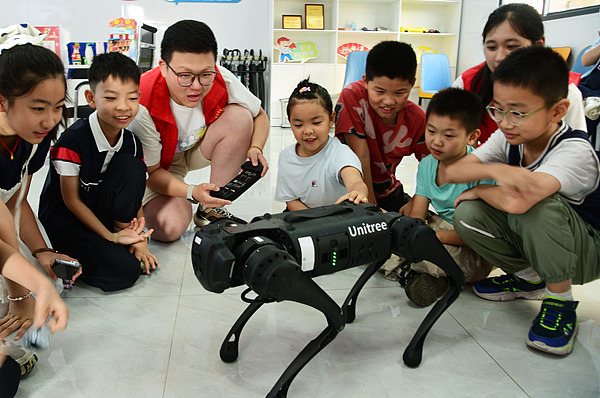7月15日,江蘇鎮江,江蘇大學志願者帶着小朋友體驗“機器狗”的功能。 視覺中國