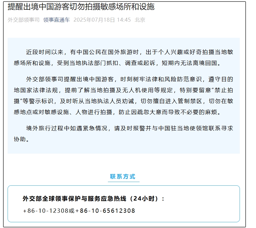 微信公眾號“領事直通車”7月18日發佈提醒:近段時間以來,有中國公民在國外旅遊時,出於個人興趣或好奇拍攝當地敏感場所和設施,受到當地執法部門抓扣、調查或起訴,短期內無法離境回國。