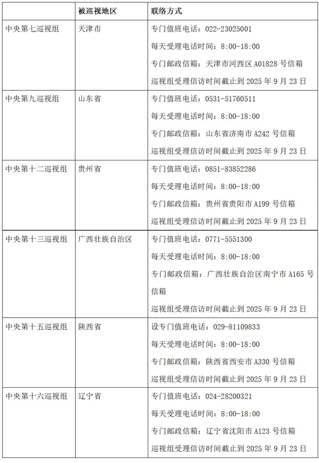 根據黨中央關於巡視工作的統一部署,近日,二十屆中央第六輪巡視的16個巡視組陸續開始進駐被巡視地區,並公佈了聯繫方式。
