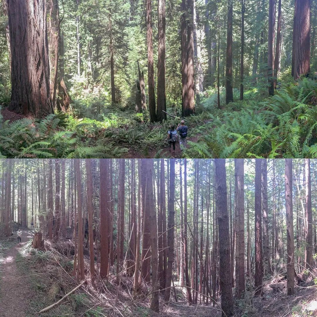 原始林(上)與次生林(下)的對比 圖:Andrew Slack,Save the Redwoods League