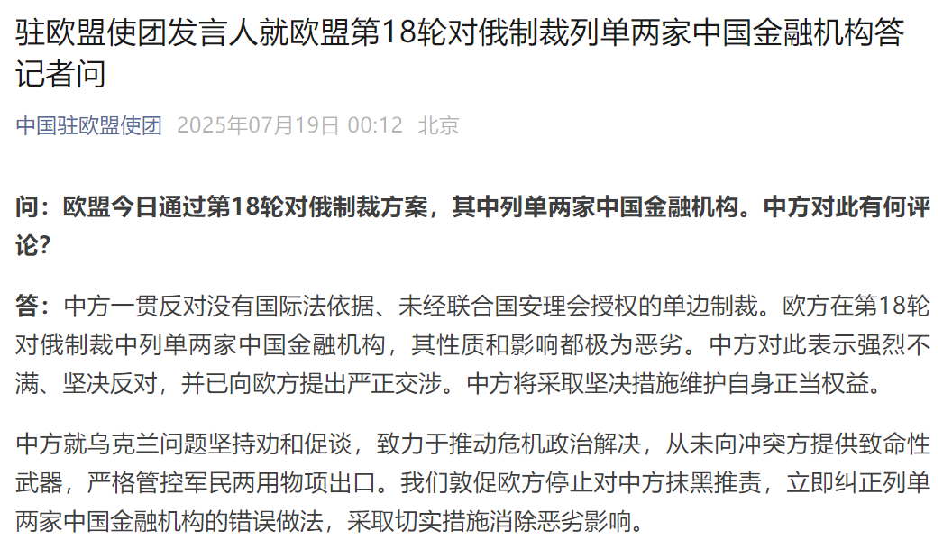 據微信公眾號“中國駐歐盟使團”7月19日消息,駐歐盟使團發言人就歐盟第18輪對俄製裁列單兩家中國金融機構答記者問。