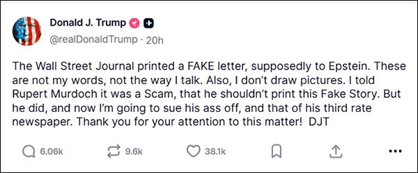 另報道,當地時間7月17日,美國總統特朗普在其社交媒體“真實社交”發文怒斥《華爾街日報》刊登其致愛潑斯坦的“偽造信件”,稱“這不是我的話,我也不畫畫”。特朗普還稱該報道“虛假、惡意、誹謗”,並表示將起訴《華爾街日報》、新聞集團及魯珀特·默多克本人。他強調,已親自警告默多克與主編艾瑪·塔克該信為偽造,但對方仍執意刊發。