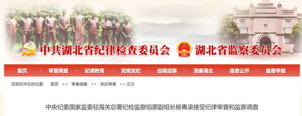 中央紀委國家監委駐海關總署紀檢監察組原副組長楊青錄接受審查調查 guancha 2025-07-19 湖北省紀委監委網站7月19日消息,中央紀委國家監委駐海關總署紀檢監察組原副組長楊青錄涉嫌嚴重違紀違法,經中央紀委國家監委指定管轄,目前正接受湖北省紀委監委紀律審查和監察調查。
