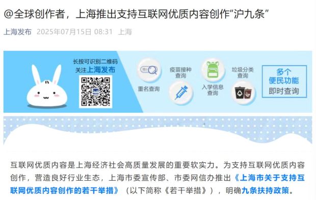上海在這周對外宣發了“滬九條”,直指內容創作行業