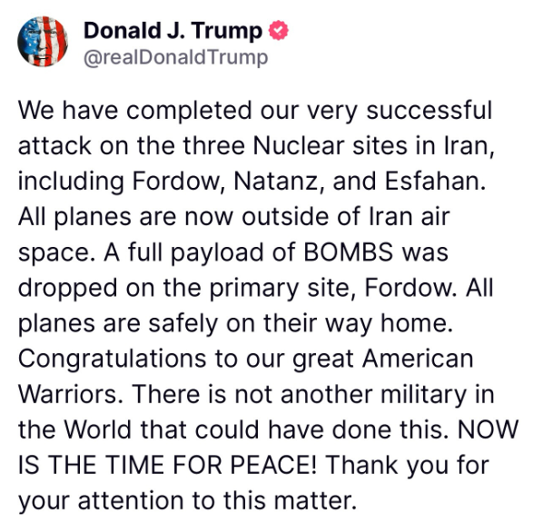 最後,美國派出7架B2轟炸機繞地球半圈來炸伊朗的三處核設施,但炸完就跑。特朗普隨即宣佈完全摧毀了伊朗的核設施,而美國國防部情報部門對此有保留,認為襲擊未能實質性摧毀伊朗核能力。看來評估美國轟炸的結果,在美國已經政治化。