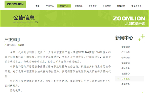 7月16日,中聯重科股份有限公司網站發佈嚴正聲明稱,我司關注到網上流傳“一身着中聯重科工裝(帶有ZOOMLION商標LOGO字樣)的男子別停摩托車”的視頻。我司對此高度重視,立即展開全面核查。經調查確認,該男子並非我司員工,與我司無勞動關係,其個人不當言行與我司無關。