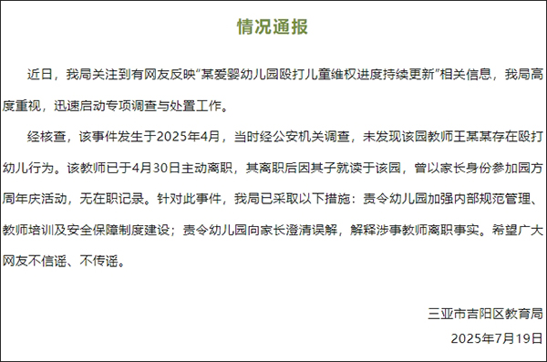 三亞市吉陽區教育局微信公眾號“吉陽教育”7月19日發佈情況通報稱,近日,我局關注到有網友反映“某愛嬰幼兒園毆打兒童維權進度持續更新”相關信息,我局高度重視,迅速啓動專項調查與處置工作。