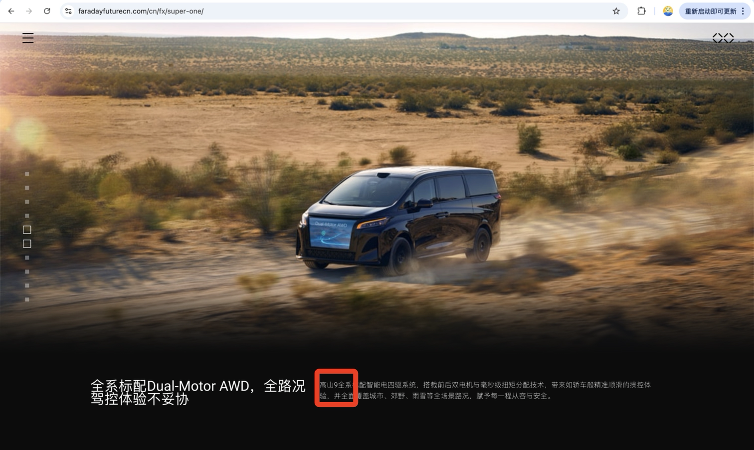 觀察者網注意到,在法拉第未來中國官網關於“Super One”的介紹頁面中,確實出現了“高山9”的字樣,這一表述也引發熱議。