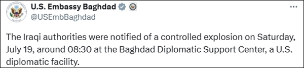 當地時間7月19日,美國駐伊拉克巴格達大使館在社交平台上發文稱,伊拉克當局接到通知,當天上午8時30分,美方下屬外交設施巴格達外交支持中心發生“可控爆炸”。聲明尚未透露更多具體細節,且未説明此次“可控爆炸”的原因。