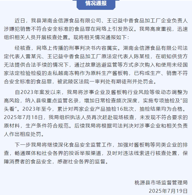 自2023年案發以來,我局將涉事企業及醬板鴨行業風險等級動態調整為高風險,納入縣級重點監管名錄,增加日常檢查頻次深度,實施專項抽檢及“回頭看”。2023年至今,累計對兩家企業產品抽檢16批次,抽檢結果均為合格。2025年7月18日,我局組織執法人員再次趕赴現場核查,未發現不符合要求的原材料,生產條件符合規範。後續我局將根據司法判決對涉事企業和相關負責人作出相應處罰。