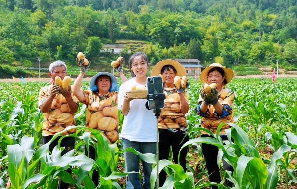 村播在田間直播助農賣土豆。人民網/重慶巫山縣融媒體中心供圖