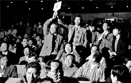 1987年深圳首次舉行國有土地拍賣,時任深圳經濟特區房地產公司總經理駱錦星(左)競拍成功,與同事欣喜地舉牌。大公網