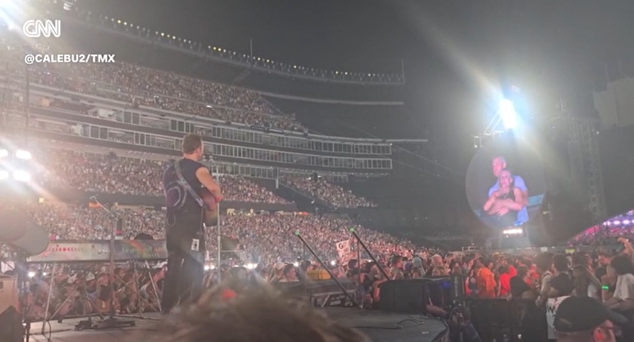 7月16日,英國“酷玩樂隊”在美國馬薩諸塞州福克斯堡舉行演唱會。一台攝像機拍下了拜倫摟抱卡伯特的畫面。報道稱,兩人看到自己出現在屏幕上時,很快就分開了,卡伯特轉過身,用手捂住臉,拜倫則蹲了下去。