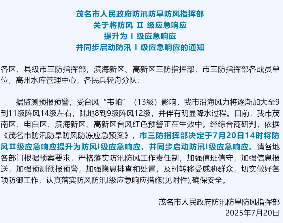 經綜合商研判,依據《茂名市防汛防旱防風防凍應急預案》,市三防指揮部決定於7月20日14時將防風Ⅱ級應急響應提升為防風I級應急響應,並同步啓動防汛I級應急響應。