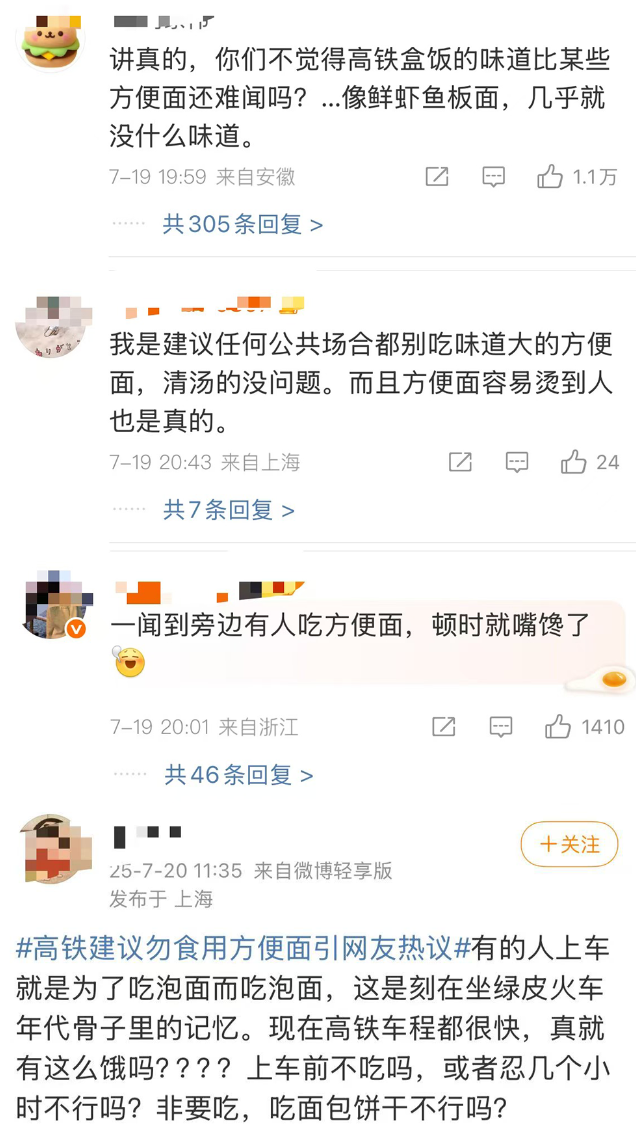 這兩天,高鐵上能不能吃泡麪再次引發關注,話題一度衝上熱搜榜單。