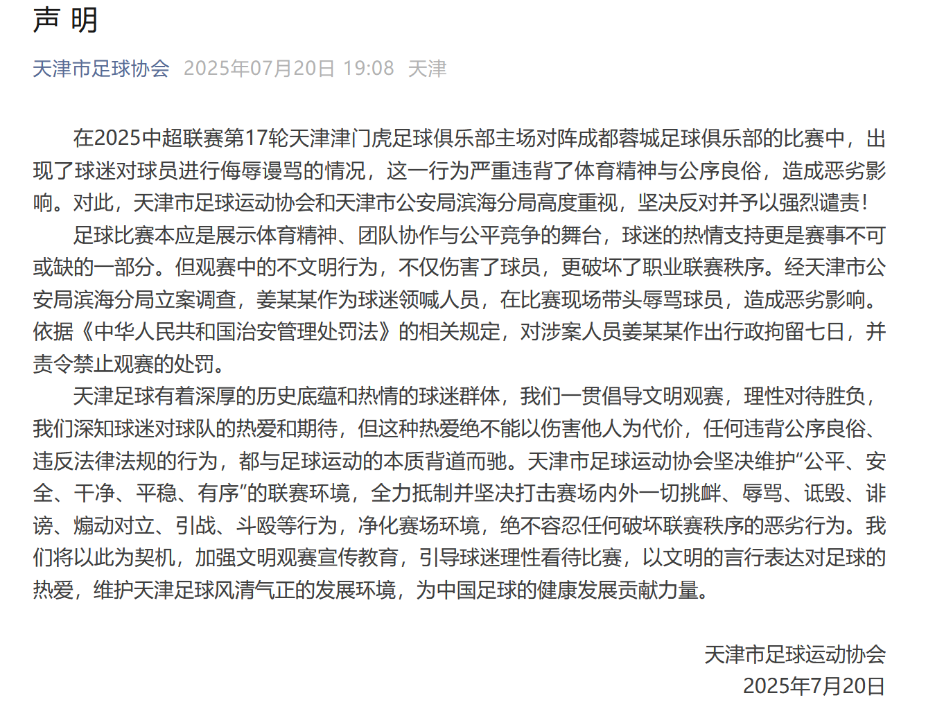 7月20日,天津市足球運動協會發布聲明稱,在2025中超聯賽第17輪天津津門虎足球俱樂部主場對陣成都蓉城足球俱樂部的比賽中,出現了球迷對球員進行侮辱謾罵的情況,這一行為嚴重違背了體育精神與公序良俗,造成惡劣影響。對此,天津市足球運動協會和天津市公安局濱海分局高度重視,堅決反對並予以強烈譴責。