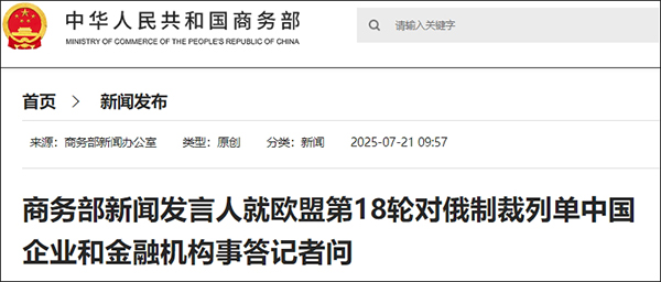 據商務部網站7月21日消息,商務部新聞發言人就歐盟第18輪對俄製裁列單中國企業和金融機構事答記者問。
