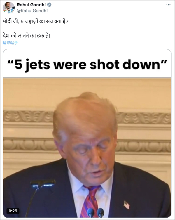 當地時間7月19日,拉胡爾·甘地在社交平台上發佈了特朗普上述言論的視頻,並寫道:“莫迪先生,5架戰機背後的真相是什麼?”