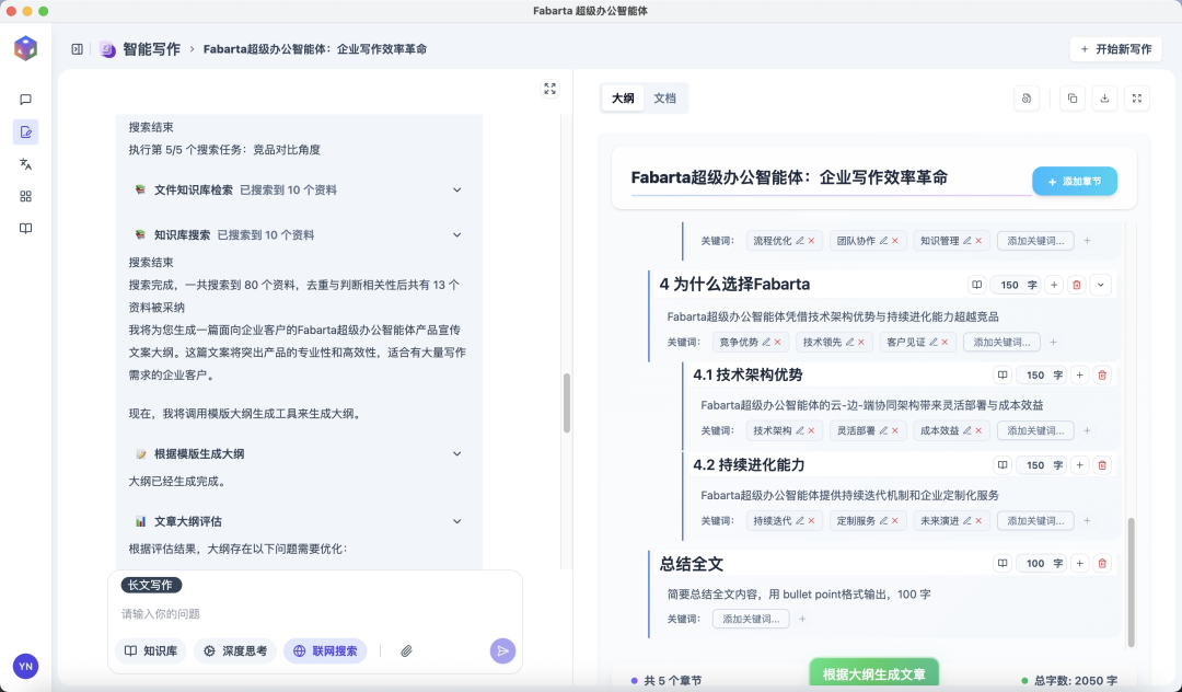 在智能長文寫作方面,Fabarta個人專屬智能體內置海量專業寫作模板,可輕鬆匹配不同的專業寫作場景,自動產出貼合主題版式和風格的文稿。結合個人本地知識庫內容與線上的有效關聯內容,既能記住用户專業領域的知識經驗和行文規範,靈活調整提綱以達成專業度要求,同時能恰當地補充高度關聯的專業信息和數據內容,寫出專業領域的好文章,成為您專屬的寫作助手。