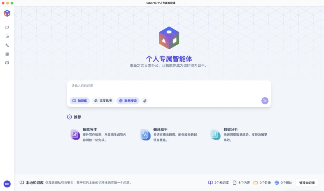 Fabarta個人專屬智能體——基於大語言模型與本地知識庫技術打造的專屬個人AI助手,可個性化地實現本地數據與公開信息的聯合智能問答檢索、智能長文寫作、智能數據分析、專業翻譯等功能。