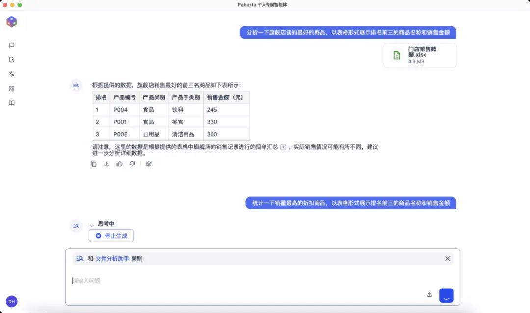 在智能數據分析方面,Fabarta個人專屬智能體在非結構化文檔分析的基礎上,具有強大的基於本地眾多複雜數據文件的分析能力,可通過智能體大腦協助用户完成基於複雜結構化數據的各種分析任務並快速給出數據概覽,且可通過簡單對話的方式,在保證數據安全的前提下及時響應用户的分析需求,彌補大語言模型對結構化數據分析計算方面的天然缺陷。