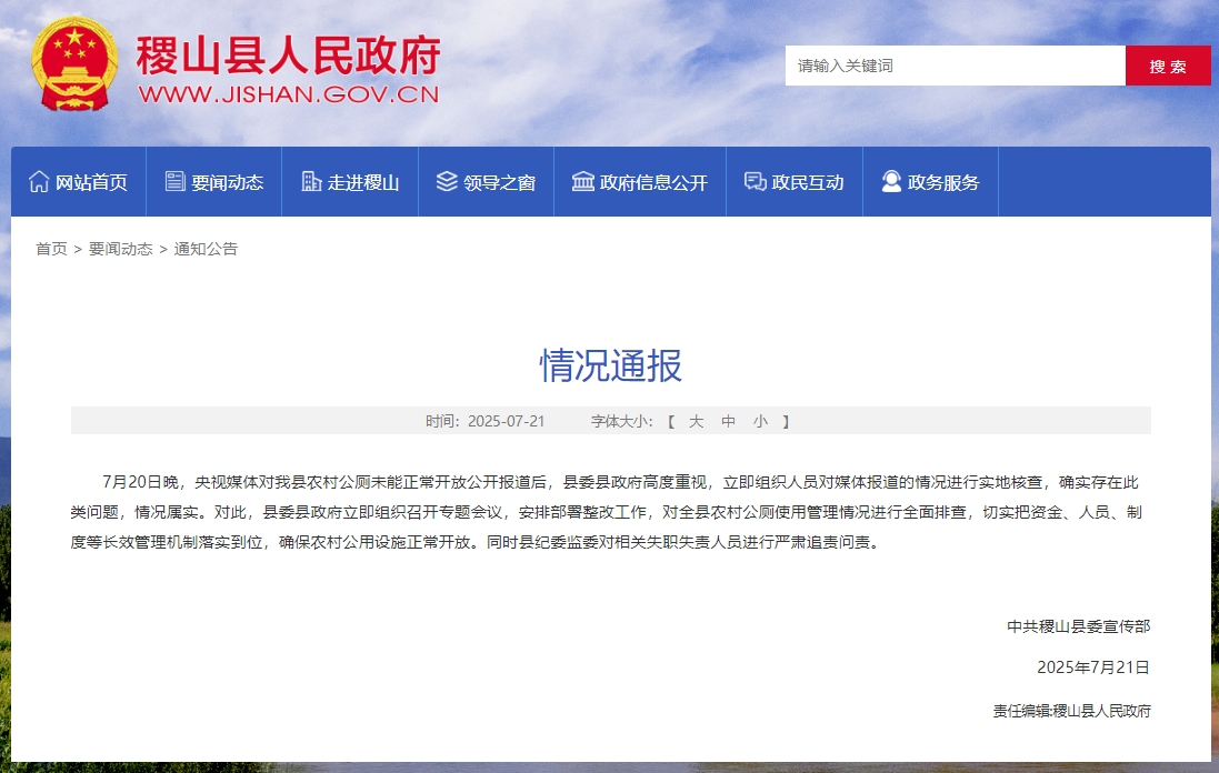 據山西運城市稷山縣人民政府網站消息,稷山縣委宣傳部7月21日發佈情況通報稱,7月20日晚,央視媒體對我縣農村公廁未能正常開放公開報道後,縣委縣政府高度重視,立即組織人員對媒體報道的情況進行實地核查,確實存在此類問題,情況屬實。對此,縣委縣政府立即組織召開專題會議,安排部署整改工作,對全縣農村公廁使用管理情況進行全面排查,切實把資金、人員、制度等長效管理機制落實到位,確保農村公用設施正常開放。同時縣紀委監委對相關失職失責人員進行嚴肅追責問責。