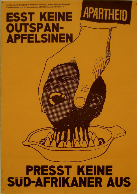 西德當年反種族隔離,支持貿易禁運的宣傳畫:“不要吃Outspan牌橙子 / 不要榨乾南非人民”