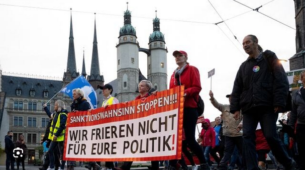2022年,德國街頭反制裁遊行橫幅:“停止瘋狂的制裁!我們不願為你們的政策買單”
