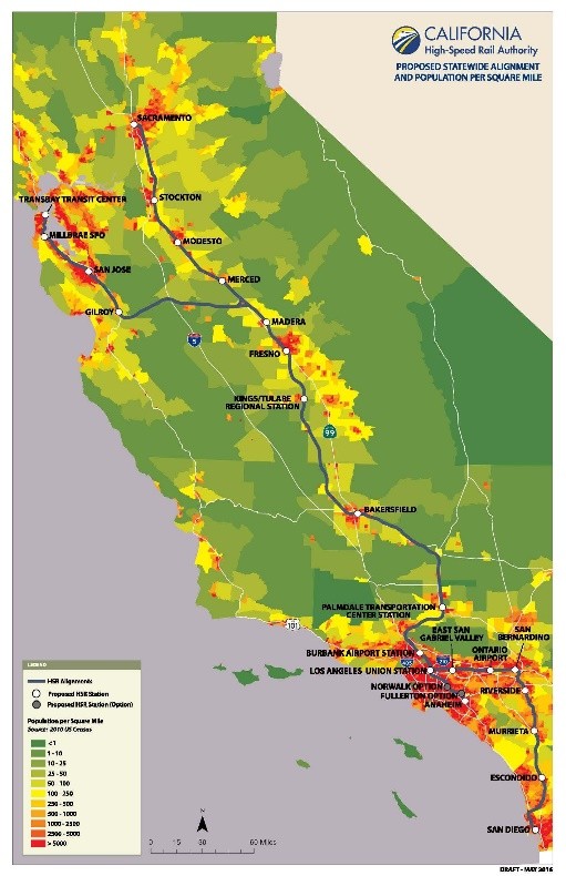 2016年加州高鐵規劃與人口密度高度重合