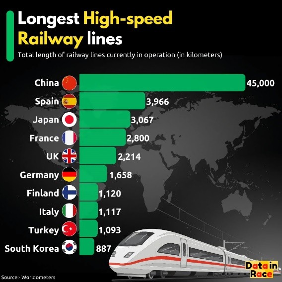 2024年中期,各國高鐵運營總里程(圖源:見水印)