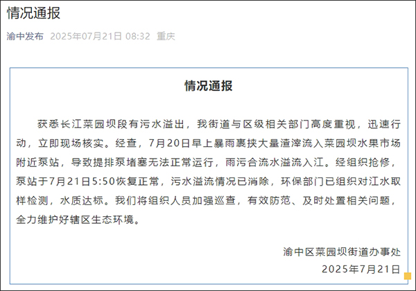 據重慶渝中區微信公眾號“渝中發佈”消息,渝中區菜園壩街道辦事處7月21日發佈情況通報稱,獲悉長江菜園壩段有污水溢出,我街道與區級相關部門高度重視,迅速行動,立即現場核實。經查,7月20日早上暴雨裹挾大量渣滓流入菜園壩水果市場附近泵站,導致提排泵堵塞無法正常運行,雨污合流水溢流入江。經組織搶修,泵站於7月21日5:50恢復正常,污水溢流情況已消除,環保部門已組織對江水取樣檢測,水質達標。我們將組織人員加強巡查,有效防範、及時處置相關問題,全力維護好轄區生態環境。