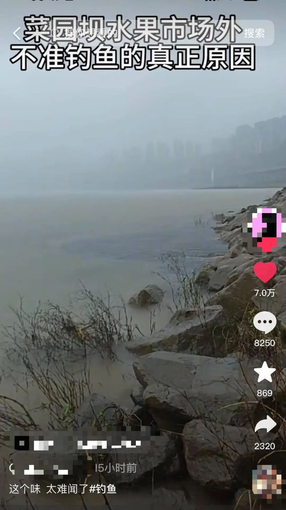 視頻中,岸邊向江裏排出顏色較深的水,在江中也形成了界限分明的區域。視頻拍攝者稱,拍攝時還在下雨,氣味刺鼻。地圖顯示,菜園壩街道水果批發市場外就是長江。