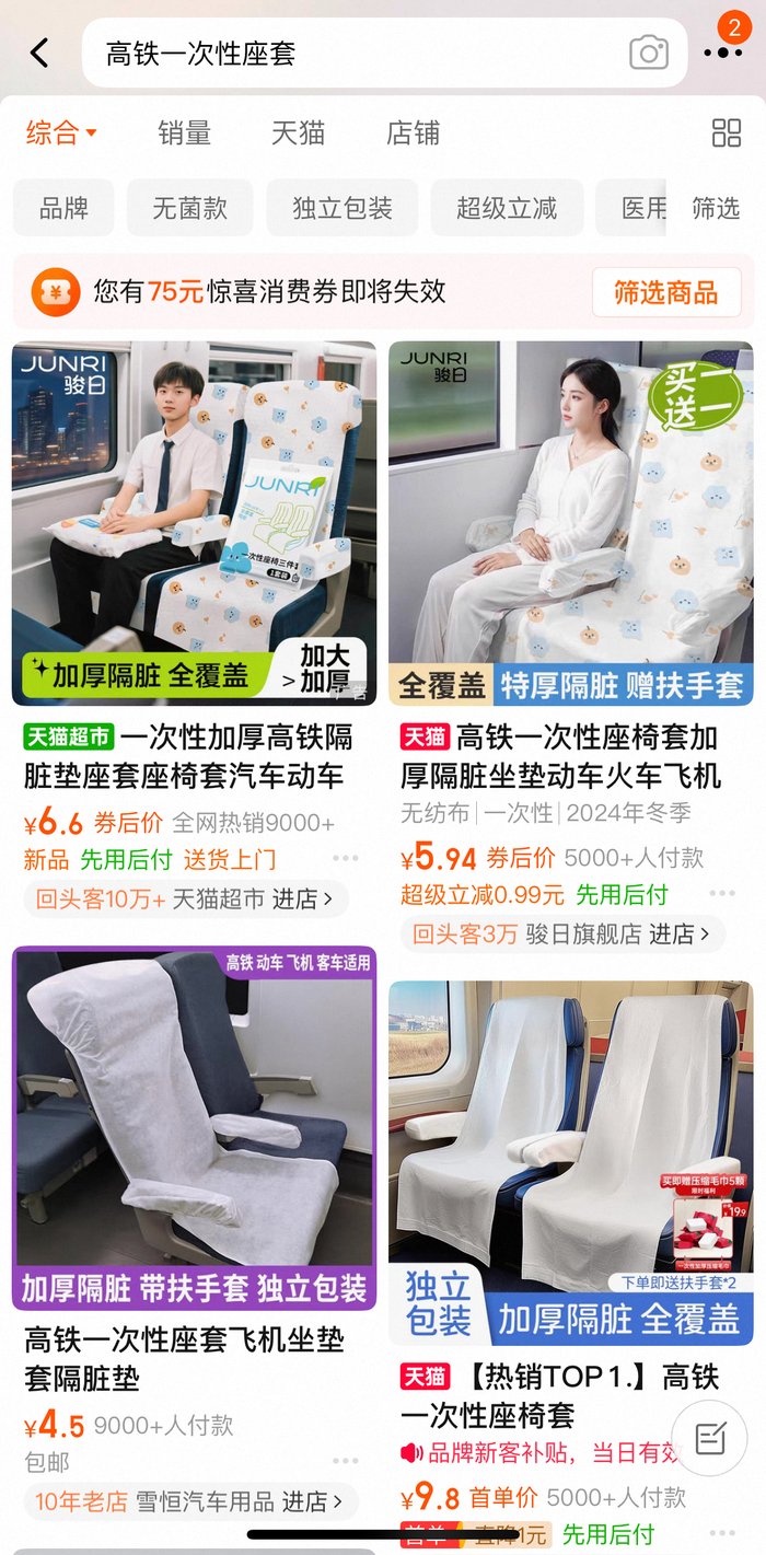 據界面新聞報道,各大電商平台均有不少高鐵一次性座套出售,成為備受旅客青睞的 “出行神器”。這些座套材質多為無紡布或塑料,設計上貼合高鐵座椅形狀,有的還帶有卡通圖案,適合兒童使用。其可覆蓋高鐵頭部靠枕至椅底區域,如果擔心扶手衞生問題,還可選擇帶扶手套的產品。