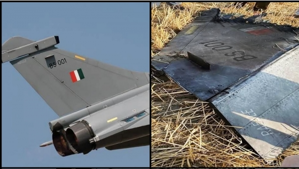 網傳飛機殘骸照片(右),以及此前印度空軍序列號為"BS 001"的陣風戰機照片。