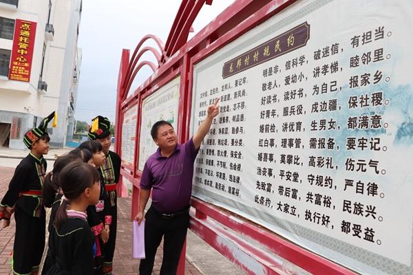 百色市田東縣思林鎮龍邦村黨總支部書記藍茂東帶領龍邦兒童傳唱村規民約。 思林鎮政府供圖