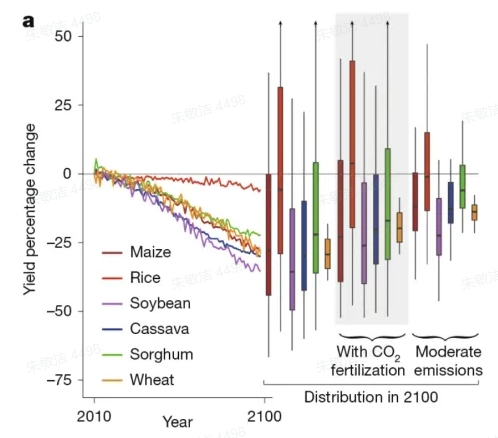 模型顯示,當地球變暖時,全球水稻產量有50%的可能性會增加,這主要是因為水稻受益於更温暖的夜晚,而到本世紀末,其他主要作物產量下降的可能性約為70%至90%。該研究模擬了一系列氣候變暖和適應情景下的未來農作物產量。作者估計,到2100年,如果全球碳排放能夠降至淨零,全球農作物產量將下降11%;如果排放量繼續不受控制地上升,全球農作物產量將下降24%。