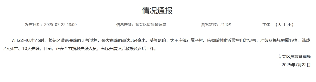 據濟南萊蕪區人民政府網站消息,山東省濟南市萊蕪區應急管理局22日發佈情況通報:7月22日0時至5時,萊蕪區遭遇強降雨天氣過程,最大點降雨量達364毫米。受其影響,大王莊鎮石屋子村、朱家峪村附近發生山洪災害,沖毀及損壞房屋19套,造成2人死亡、10人失聯。目前,正在全力搜救失聯人員,有序開展災後救援及善後工作。