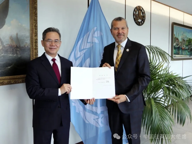 據微信公眾號“中國駐英國大使館”消息,7月21日,中國駐英國大使鄭澤光訪問國際海事組織總部,向該組織秘書長多明戈斯通報中國政府關於設立中華人民共和國常駐國際海事組織代表處的決定,並遞交中國政府委派鄭澤光為常駐代表的全權證書。