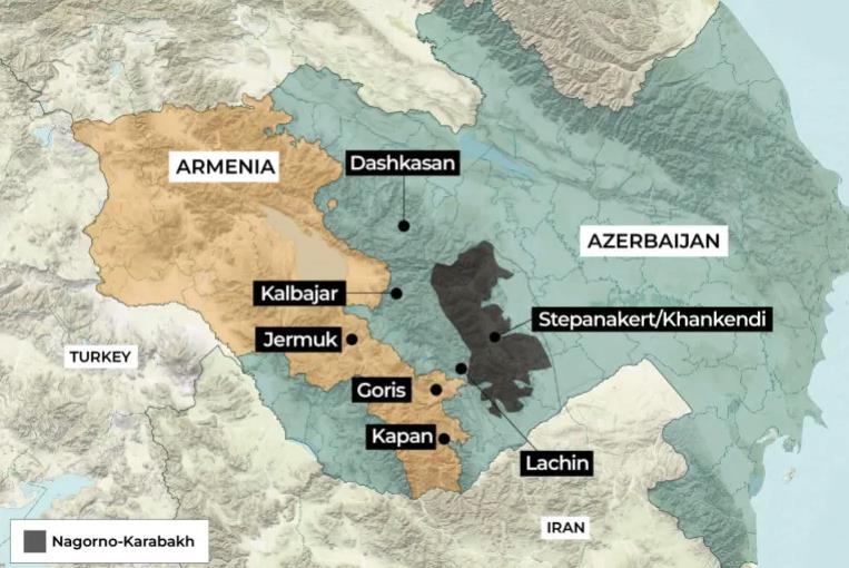 圖中深灰色部分為納卡地區 圖自半島電視台