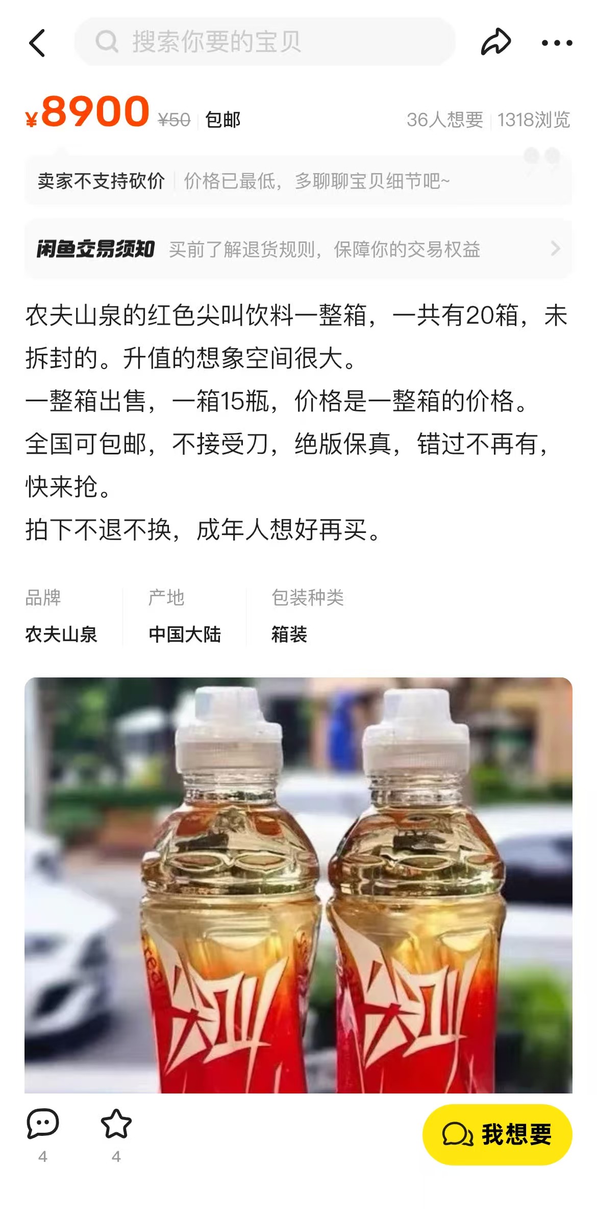 7月22日,觀察者網發現,有賣家甚至掛出了8900元一箱(15瓶)的離譜價格,並在商品簡介中強調,“升值的想象空間很大。不接受刀,絕版保真,錯過不再有,拍下不退不換。”