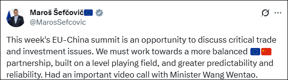 當地時間7月22日,歐盟委員會貿易和經濟安全委員謝夫喬維奇在社交媒體發文表示,即將舉行的中歐峯會是討論關鍵貿易與投資議題的契機。謝夫喬維奇寫道,“我們必須致力於構建一個更加平衡的中歐夥伴關係,建立在公平競爭、更加可預期和可靠的基礎之上。”
