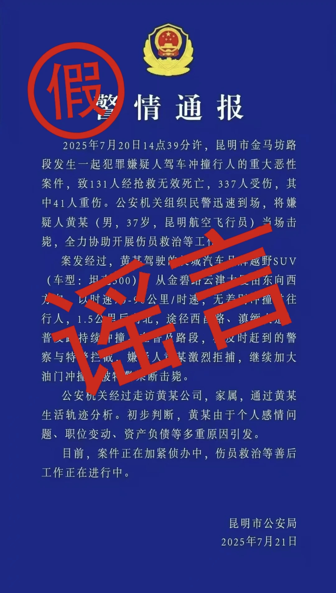 值得注意的是,此次謠言涉及7月20日發生在昆明市市中心金馬碧雞坊附近的一起交通事故。