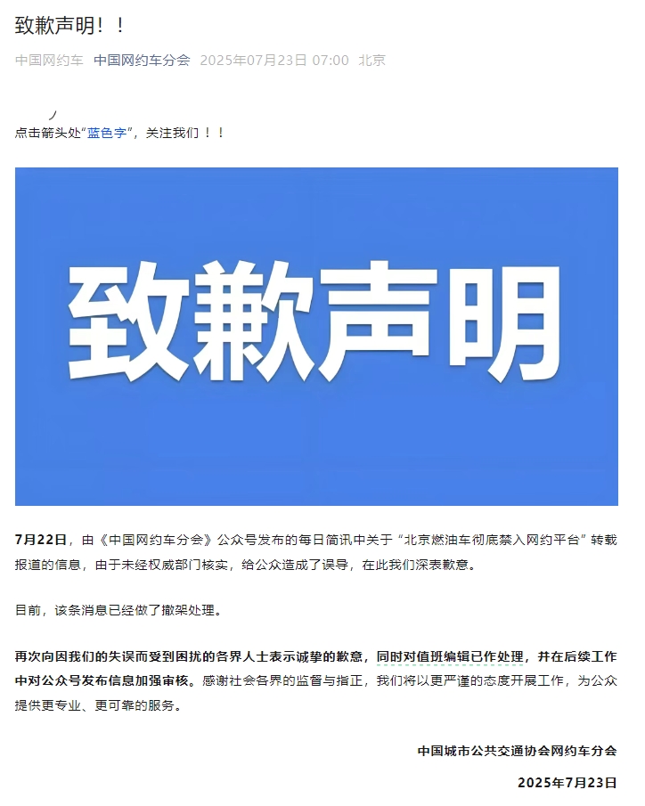 【文/觀察者網 潘昱辰 編輯/高莘】7月23日,中國城市公共交通協會網約車分會微信公眾號“中國網約車分會”發佈致歉聲明稱,此前關於 “北京燃油車徹底禁入網約平台” 轉載報道的信息,未經權威部門核實,給公眾造成了誤導,在此深表歉意。目前該消息已作撤架處理。