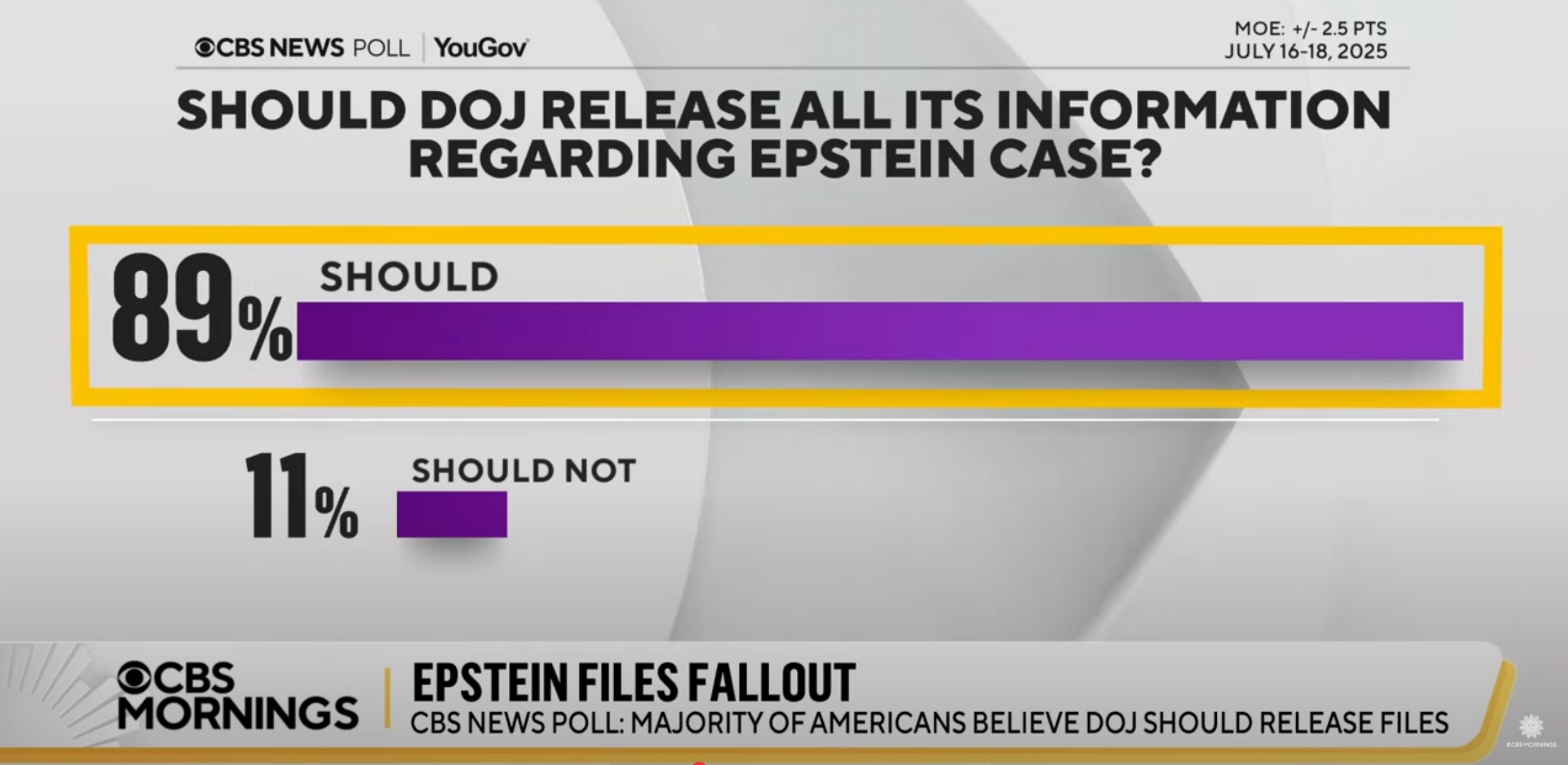 美國哥倫比亞廣播公司(CBS)21日公佈最新民調結果顯示,89%的美國人支持公開與愛潑斯坦案相關的所有文件,92%的人認為這些文件可能包含有損大批政客名流聲譽的信息。