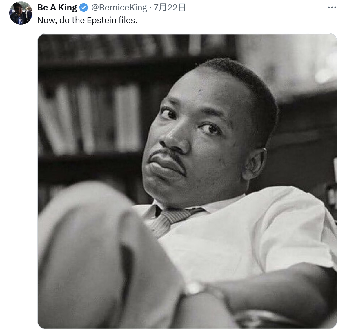 馬丁·路德·金的家人也有同感。當天,他的女兒伯妮絲·金(Bernice King)就在社交媒體X上發佈了一張父親帶有審視意味的照片,並配文“現在,該輪到愛潑斯坦案檔案了”。