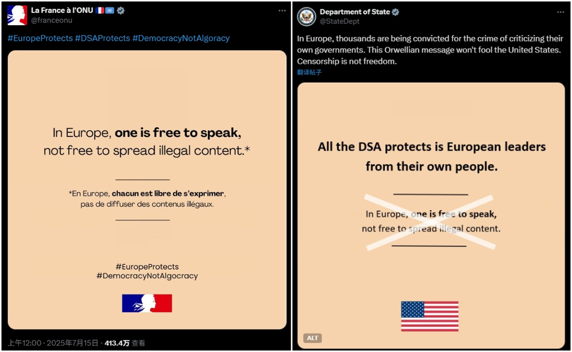7月22日,美國國務院X官方賬號轉發了法國常駐聯合國代表團的一條推文,指責歐盟《數字服務法案》(DSA)是“對言論自由的侮辱”,稱“審查並非自由”。