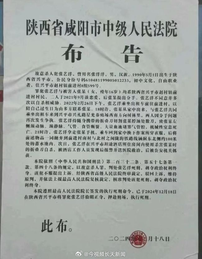 近日,陝西咸陽市中級人民法院公佈了一起殺人案件的詳細調查報告。藝人張藝洋於2022年涉嫌謀殺年僅16歲的女友,並於2024年12月18日依法被執行死刑。這是中國演藝圈首位被處決的藝人,引發了社會廣泛關注。