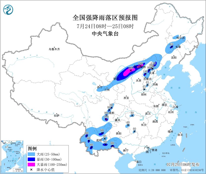 預計,7月24日08時至25日08時,內蒙古中西部偏南地區、寧夏中北部、陝西北部、山西北部、河北中北部、天津北部、北京中東部、河南東北部、四川南部和盆地西部、貴州東部和南部、湖北西南部、雲南、廣西西部以及青海東北部、甘肅東部、吉林中西部、黑龍江南部等地部分地區有大到暴雨,其中,內蒙古中西部偏南地區、山西北部、河北西部、北京東北部、四川盆地西南部等地局地有大暴雨(100~180毫米)。上述部分地區伴有短時強降水(最大小時降雨量20~50毫米,局地可超過70毫米),局地有雷暴大風等強對流天氣。