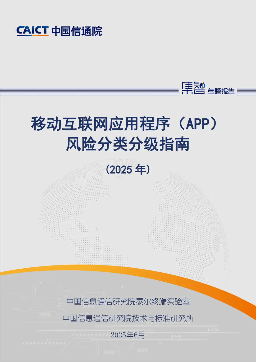 7月22日,中國信通院泰爾終端實驗室、標準所聯合發佈《移動互聯網應用程序(APP)風險分類分級指南(2025年)》(以下簡稱《指南》),通過科學分類與精準分級,為行業提供了可參考的APP風險評估框架,推動行業協同共治,促進移動互聯網生態健康有序發展。