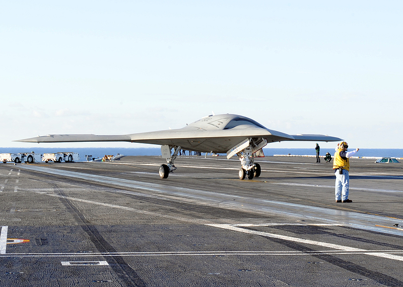 X47B是人類歷史上第一架無需人工干預、完全由電腦操縱的“無尾翼、噴氣式無人駕駛飛機”,也是第一架能夠從航空母艦上起飛並自行回落的隱形無人轟炸機。X47B於2011年首飛,並在2013年成功完成了一系列的地面及艦載測試。不過,由於未能解決隱身性能、空氣動力學和推進力之間的平衡問題,該項目於2015年被取消。